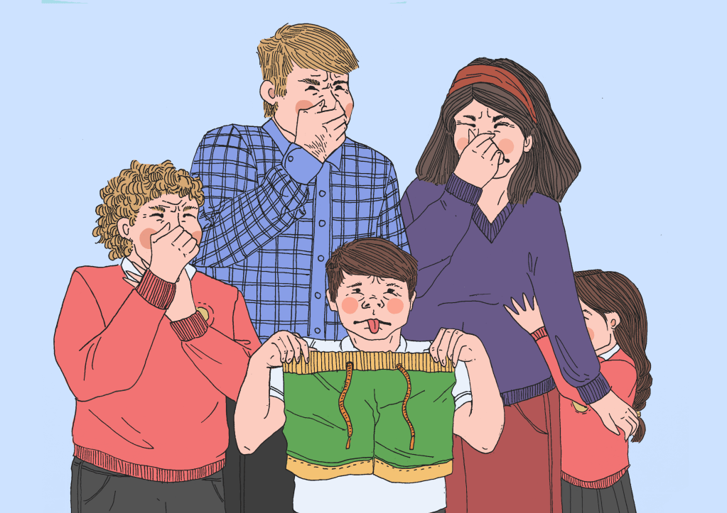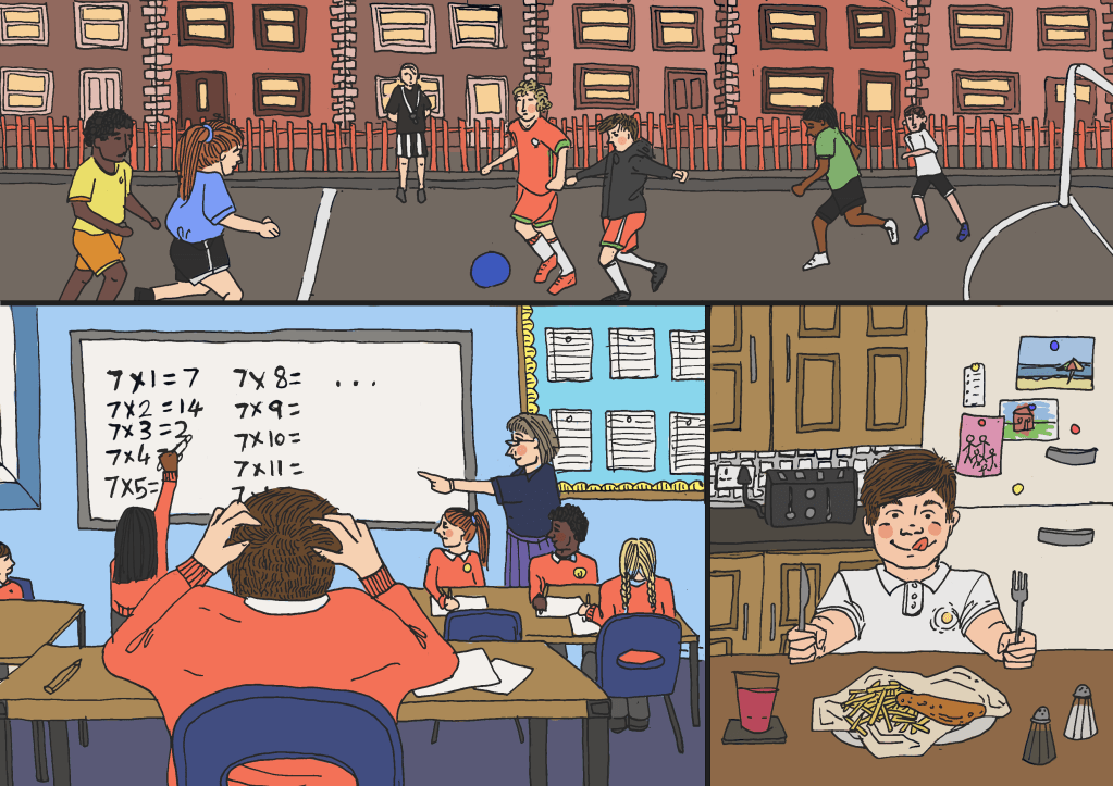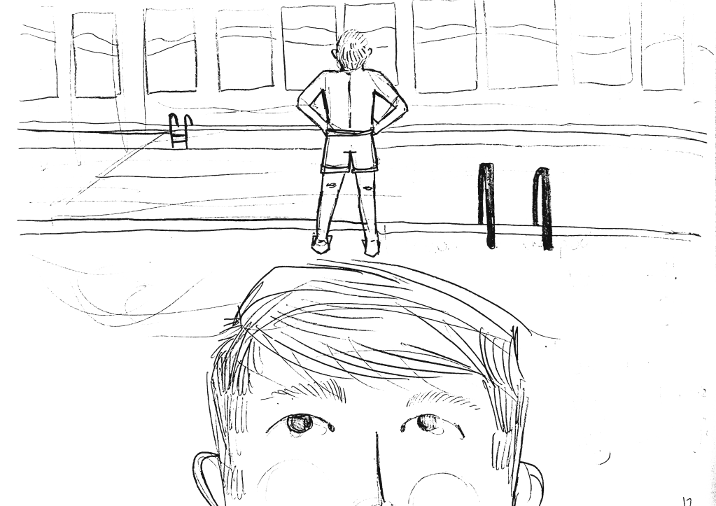 For the interior of the house, I looked no further than my childhood home. The brothers’ bedroom was designed with my brother’s childhood bedroom in mind. Lots of blue, school uniform crumpled on the floor, and everywhere all kinds of rugby and football memorabilia. I also modeled the main character’s personality on my brother too. The text gives plenty of hints to a fun little boy who just wants to play football. He’s forgetful and has everyone running around the house looking for his swimming trunks! The full dummy book can be seen below, where you can see a bit more of his mischievous personality.